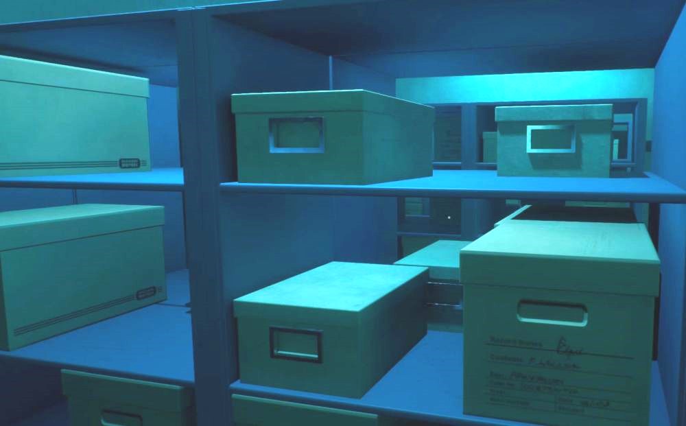 Plausible setup! There's a clear, secure point of access, and plenty of space for people to work inside. In the real world, the nice officer at the window would probably rather you ask her for what you need, instead of just walking in and digging through the files. But it's typical for games and movies to ignore that process. I'm more surprised that the person in charge of the file room seems to *also* be a uniformed police officer. Different jobs!